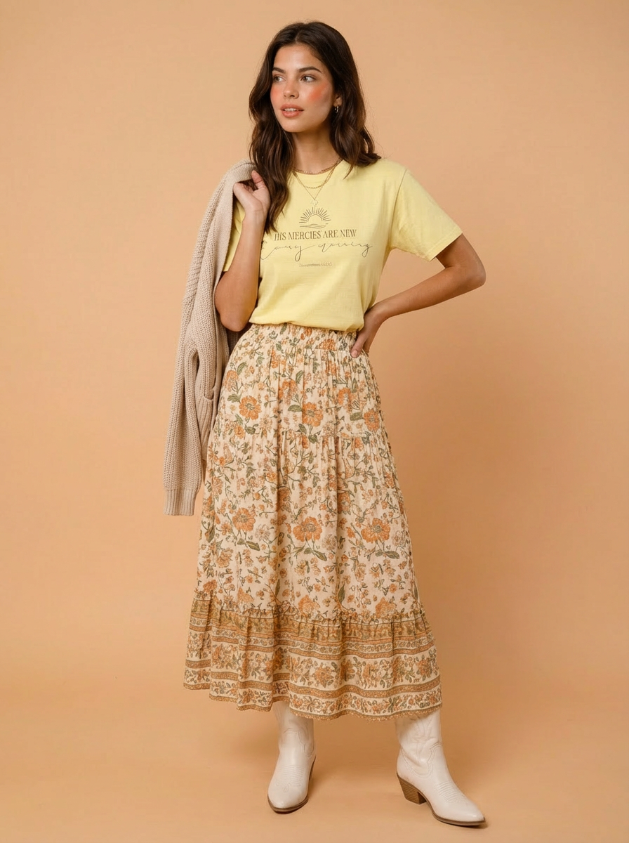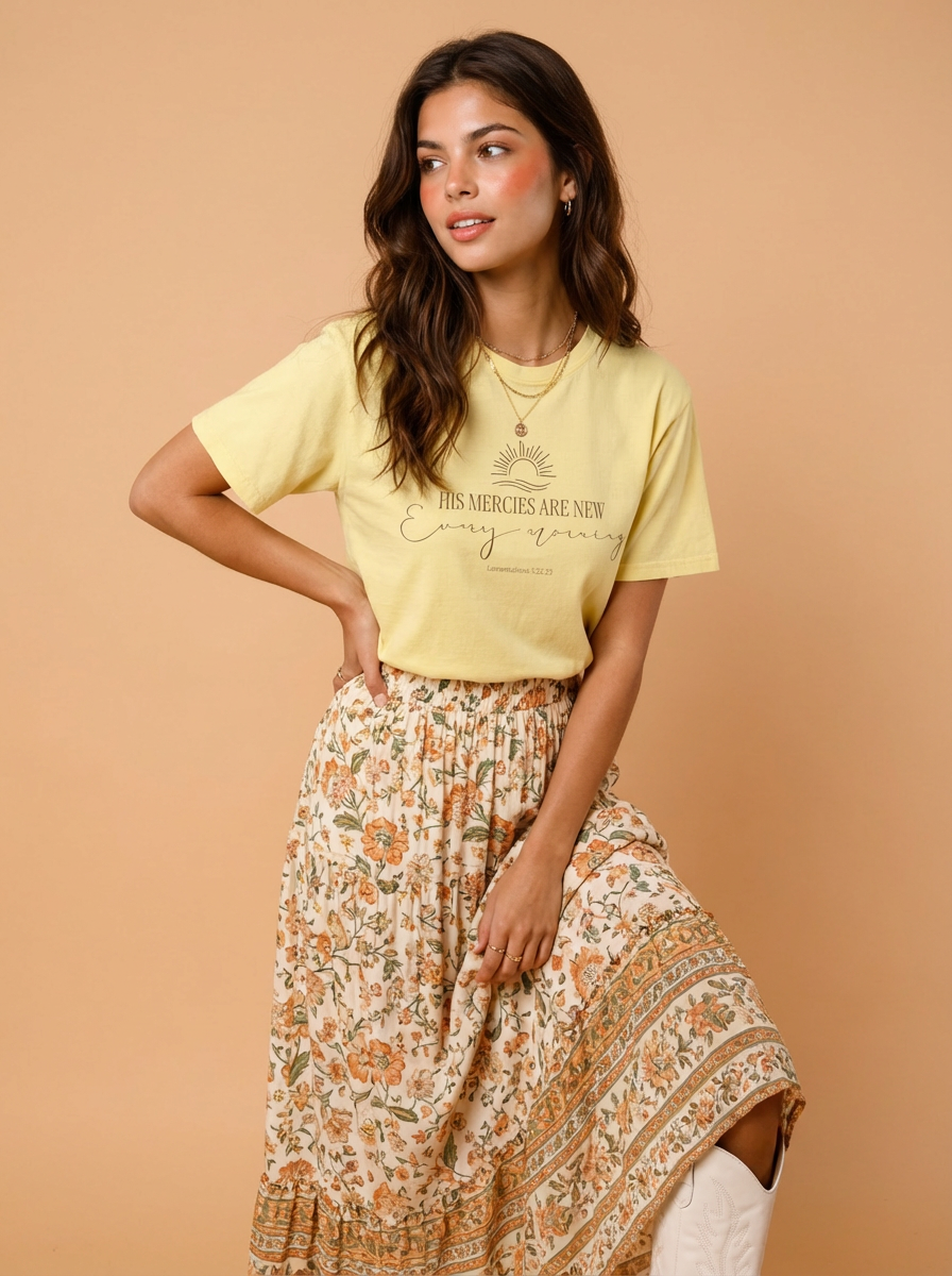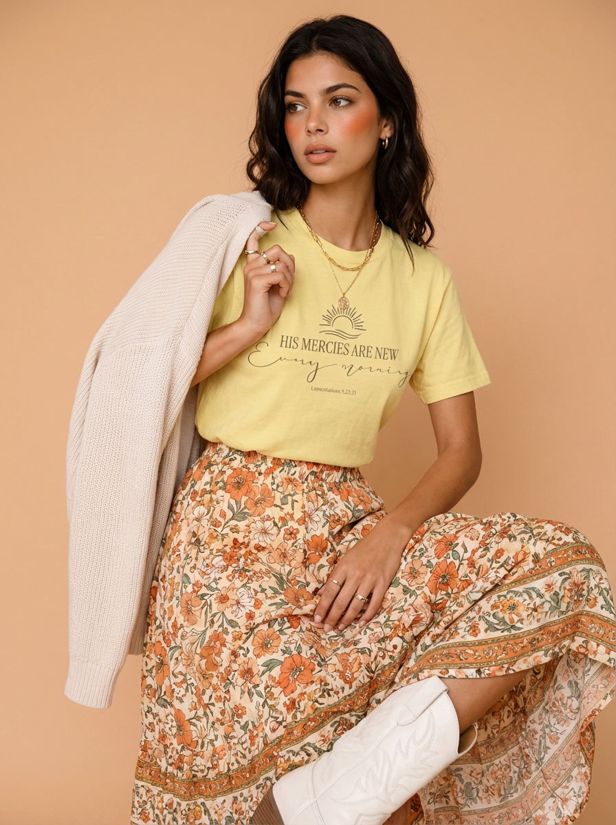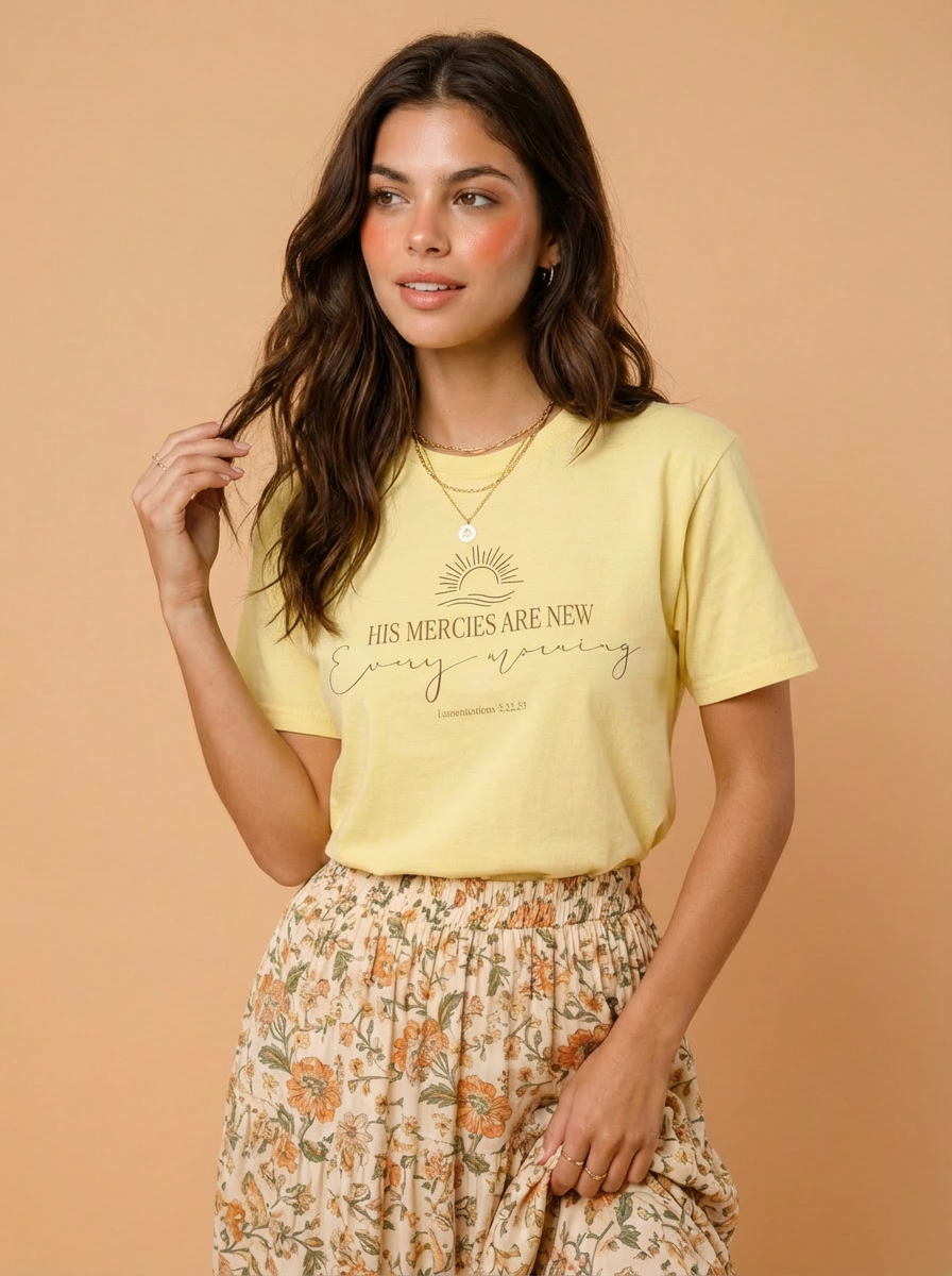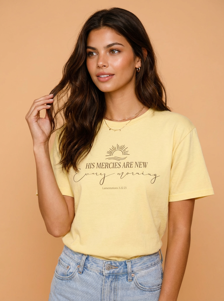 Soft, worn-in comfort with a quiet message. This garment-dyed tee brings muted, sunlit color and a relaxed fit to mornings at coffee shops, church meetups, or slow Sunday drives. The design reads gently across the chest in an understated script with a small sunrise motif — a subtle reminder of renewed hope that sits easily under a cardigan or stands alone with jeans. Breathable heavyweight cotton and a pre-shrunk, relaxed silhouette make it feel lived-in from the first wear. For people who prefer calm, meaningful wardrobe pieces that age beautifully, this tee becomes part of the everyday rhythm.