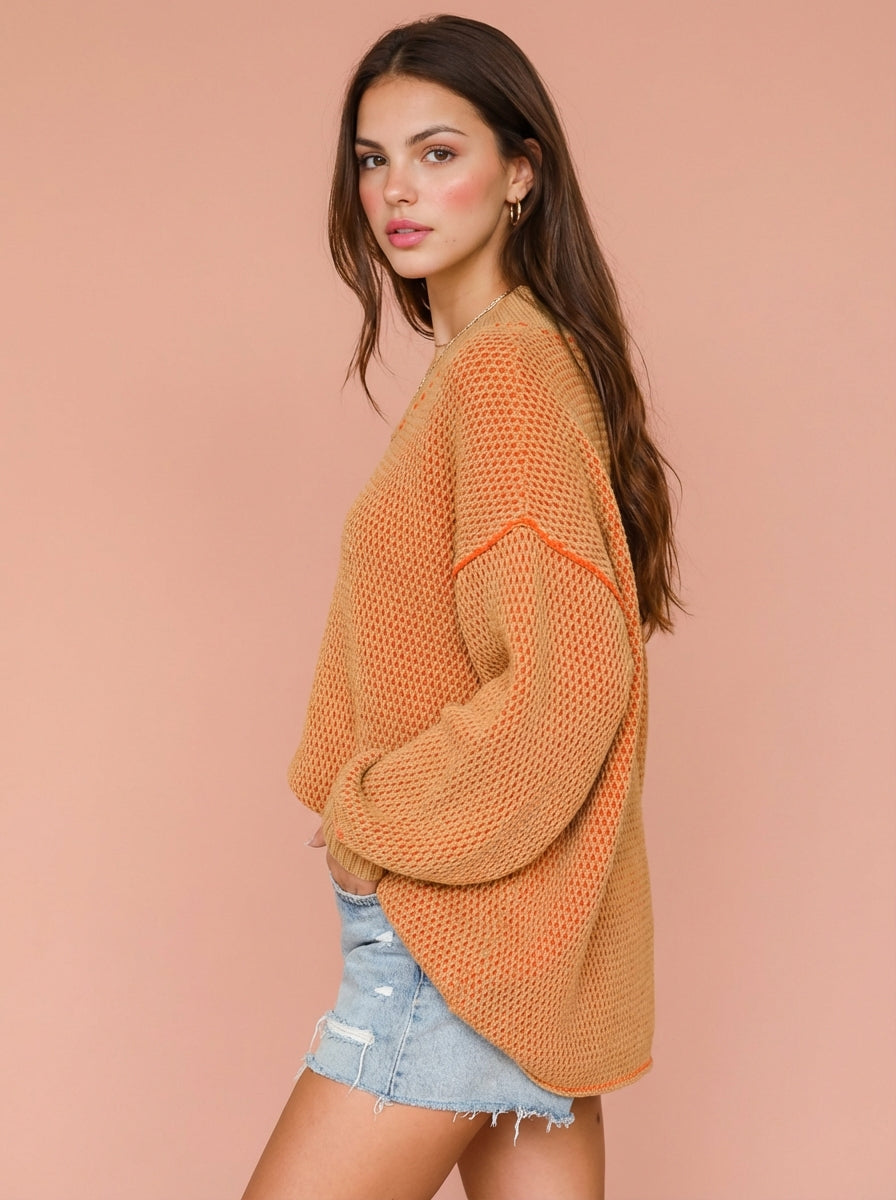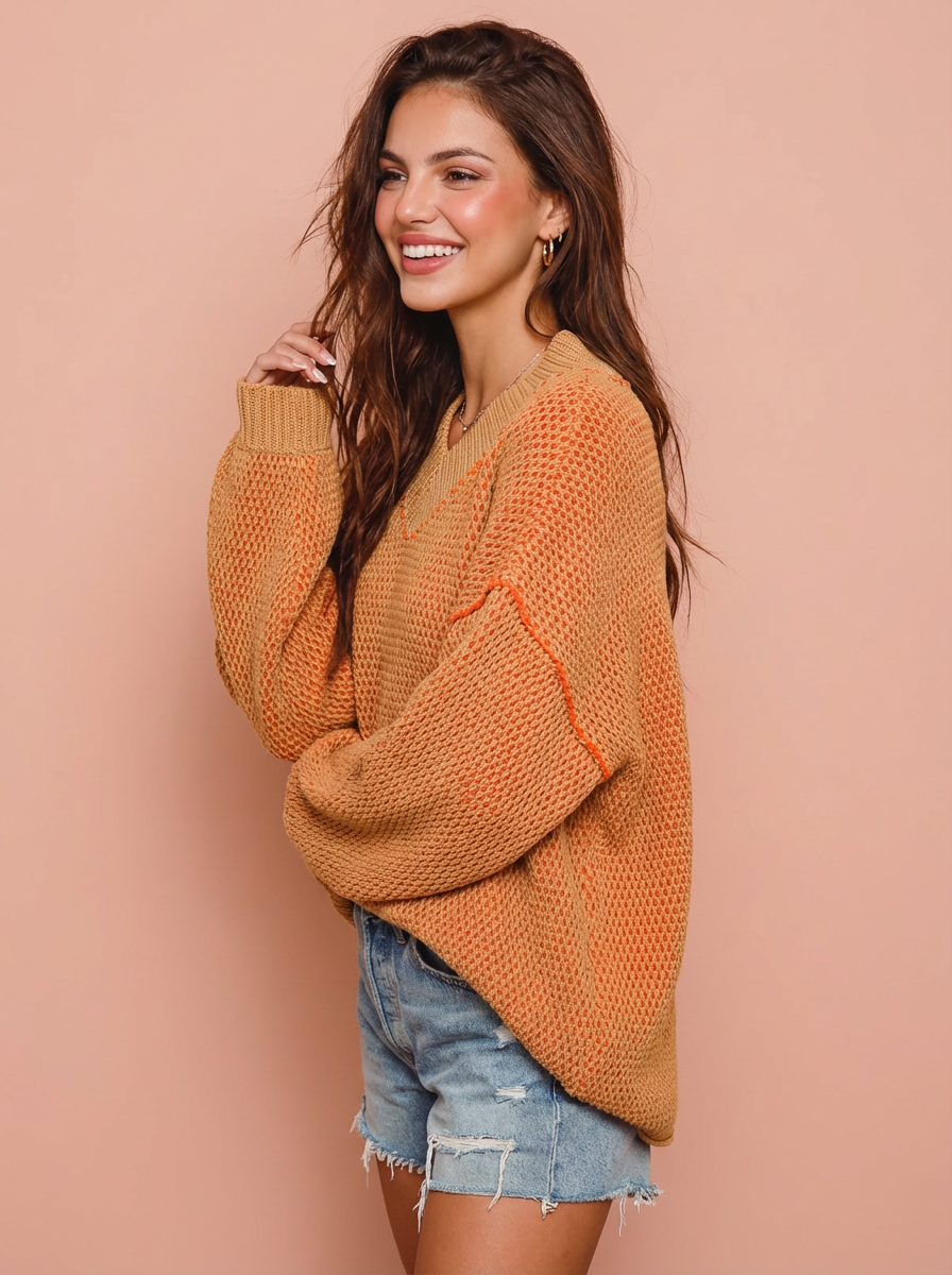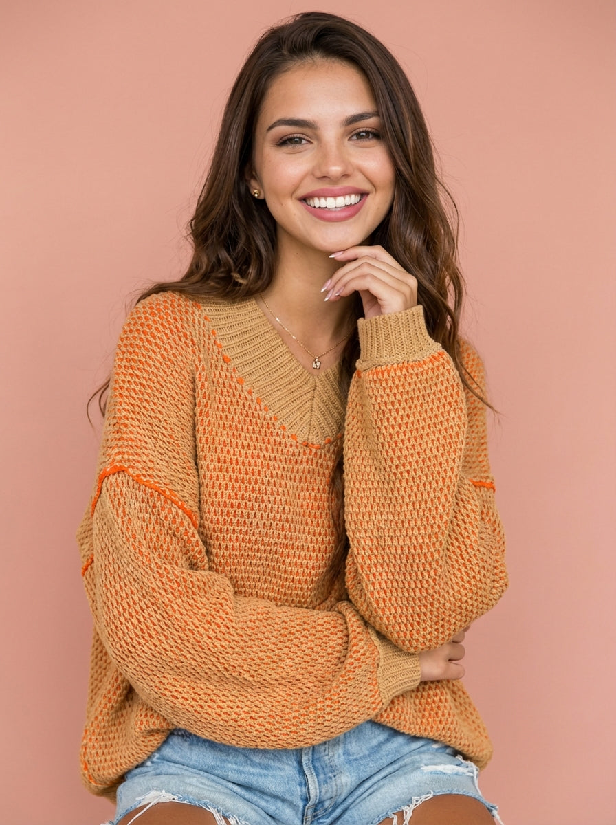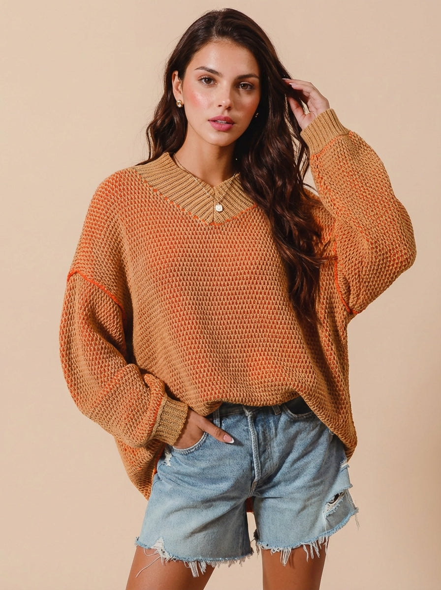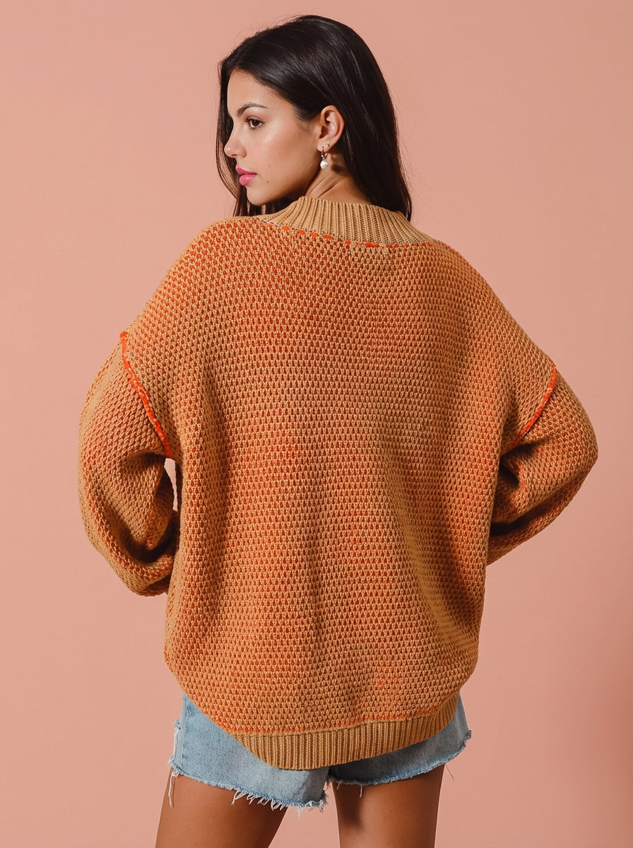 Alana Oversized Two Tone Textured V Neck Sweater