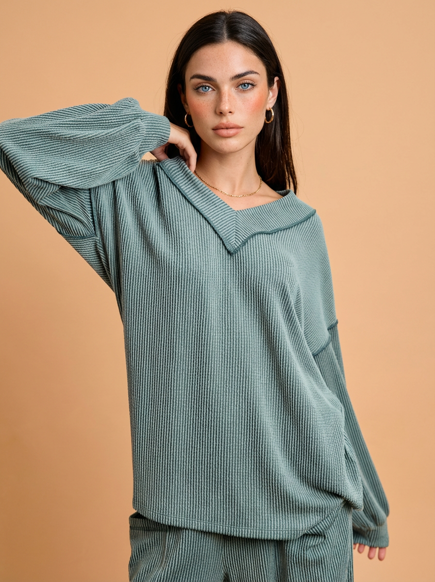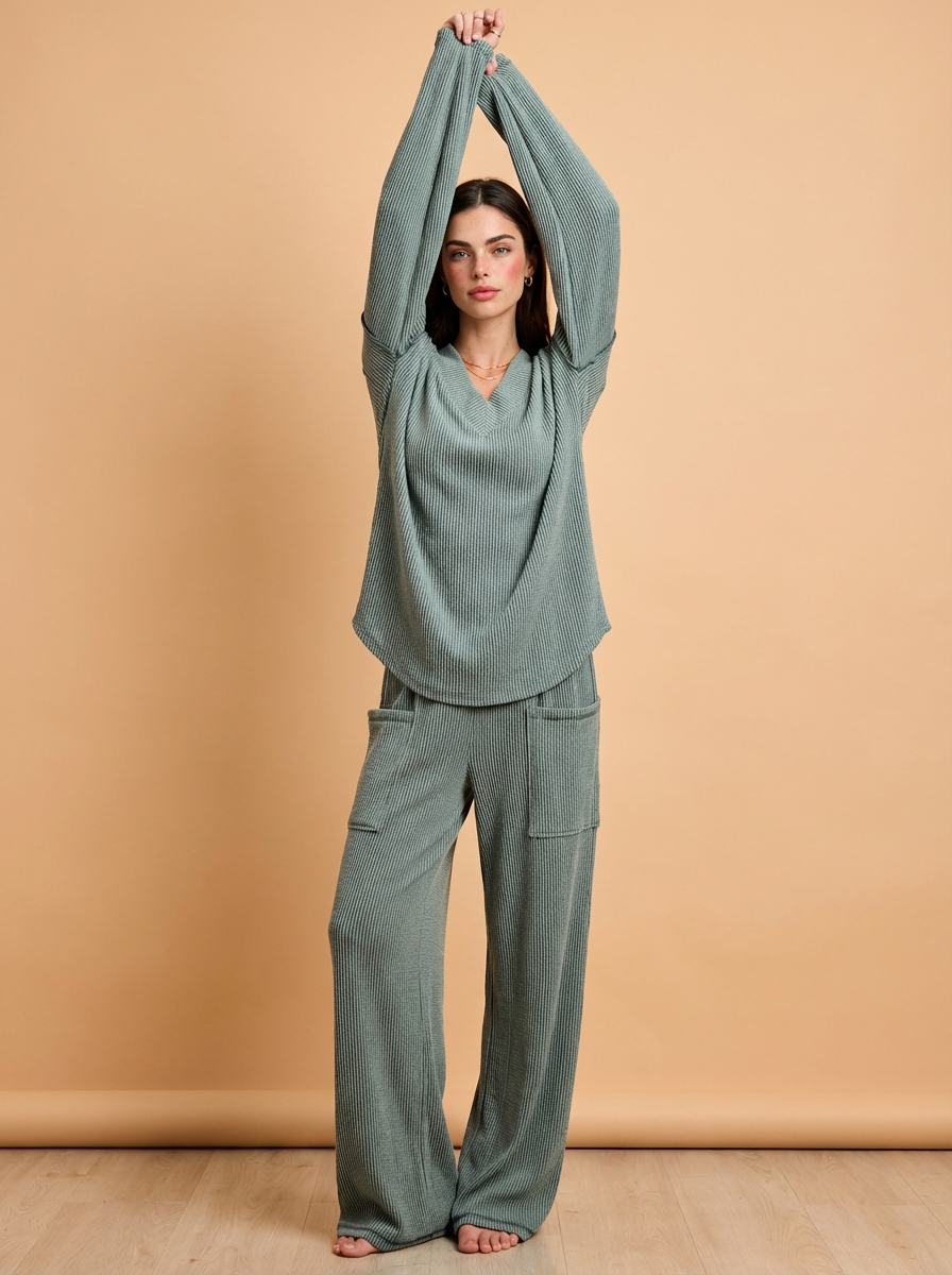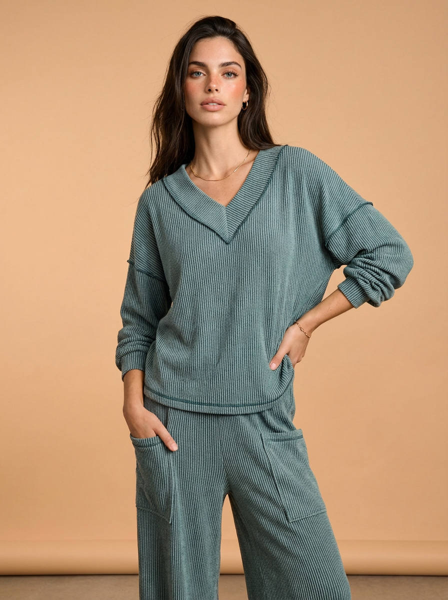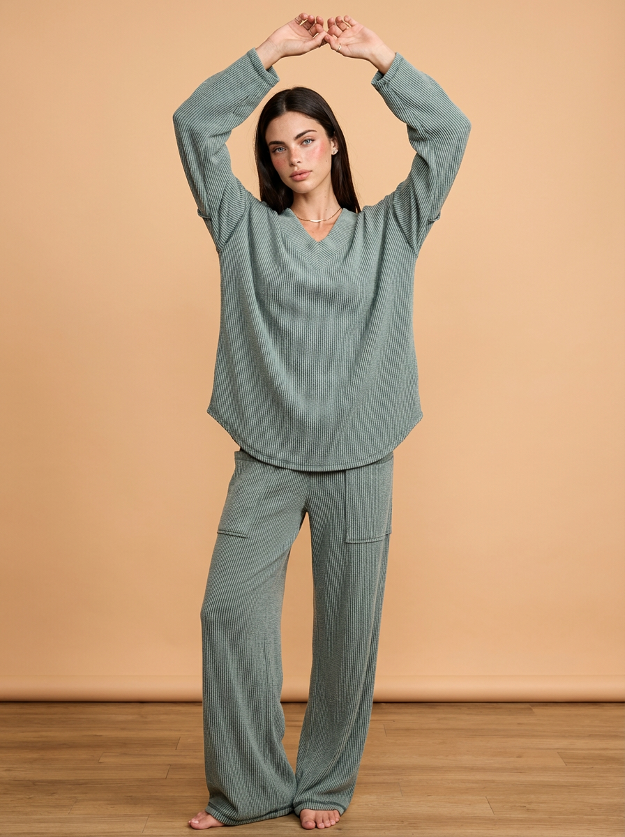 Hailey Cord Rib V-Neck Top and Pants Set