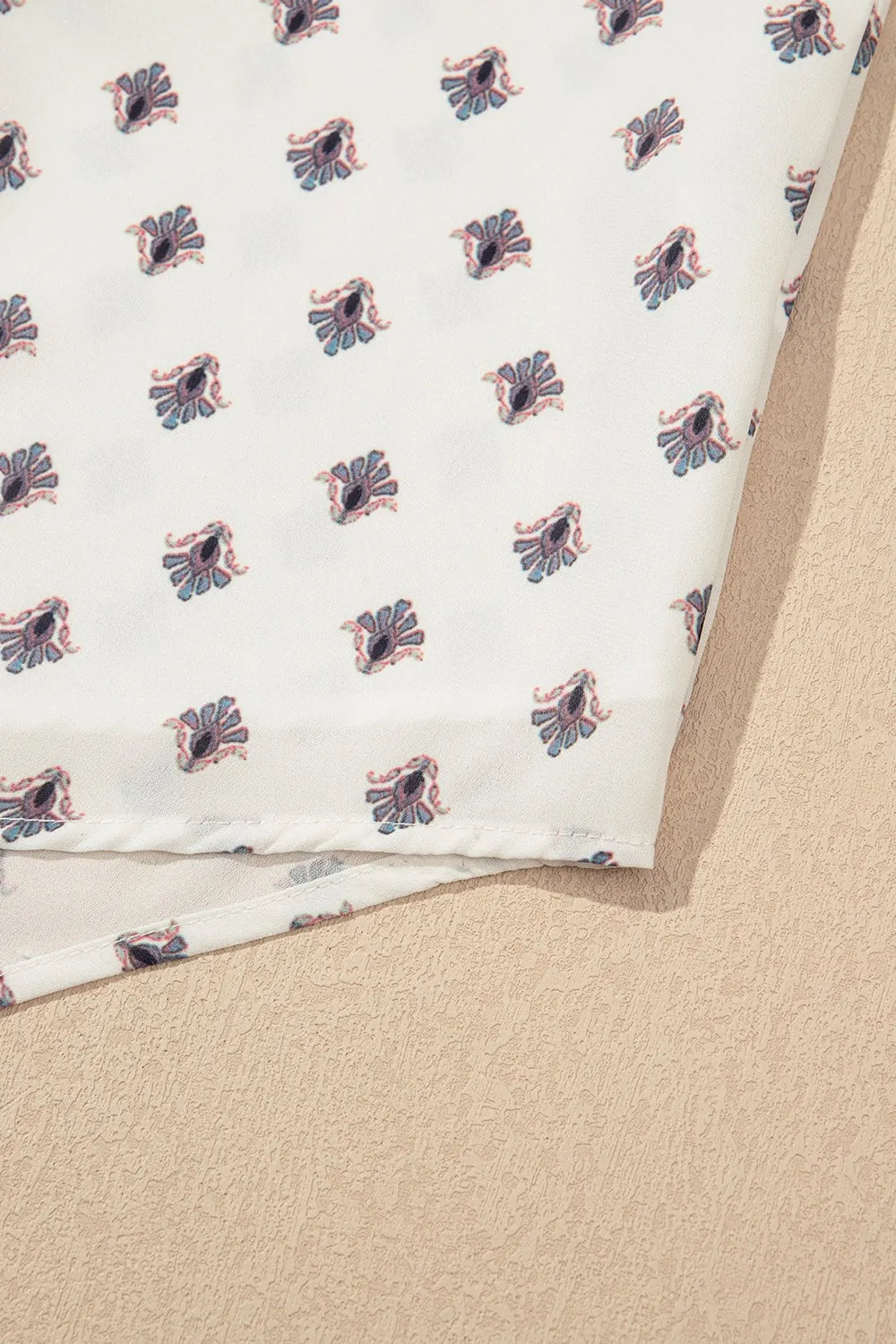 Boho Pattern Tiered Ruffled Sleeve V Neck Buttoned Blouse