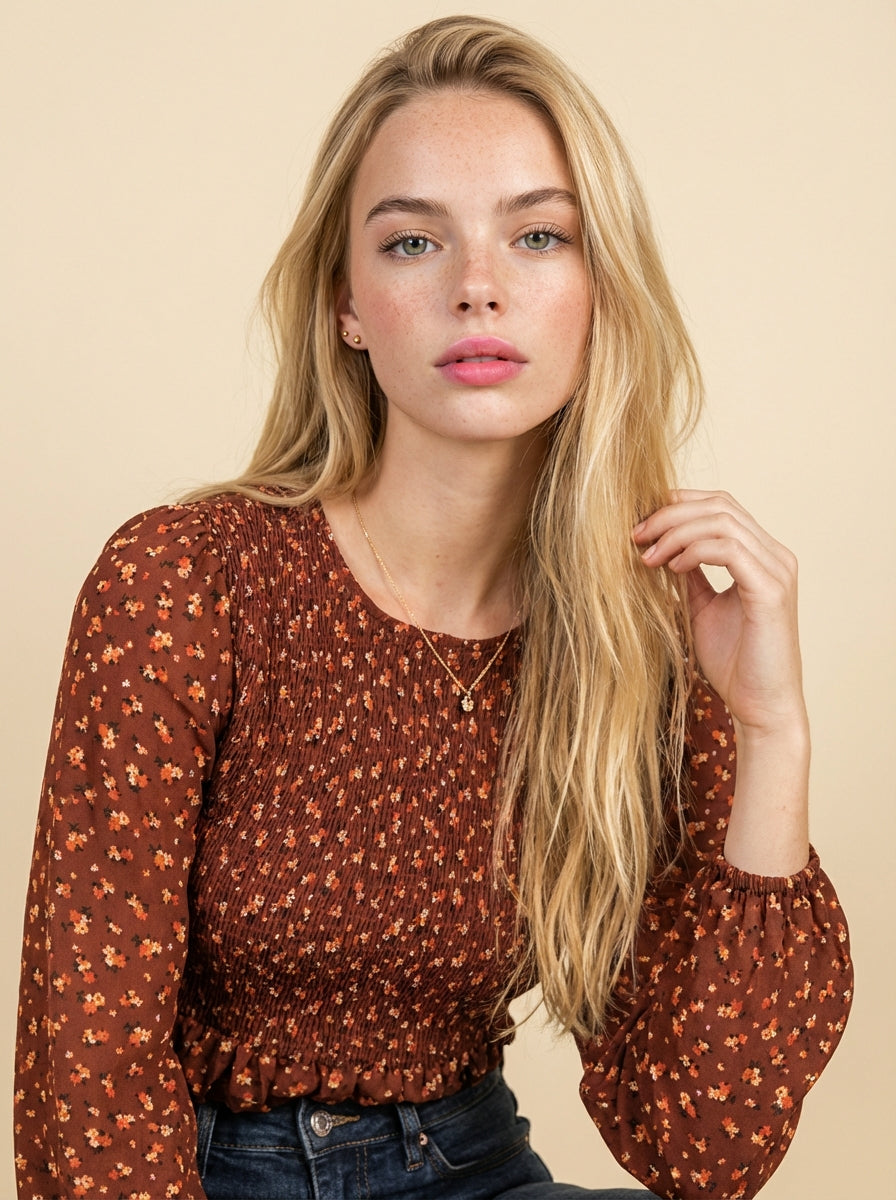 Floral Smocked Ruffle Hem Long Sleeve Blouse