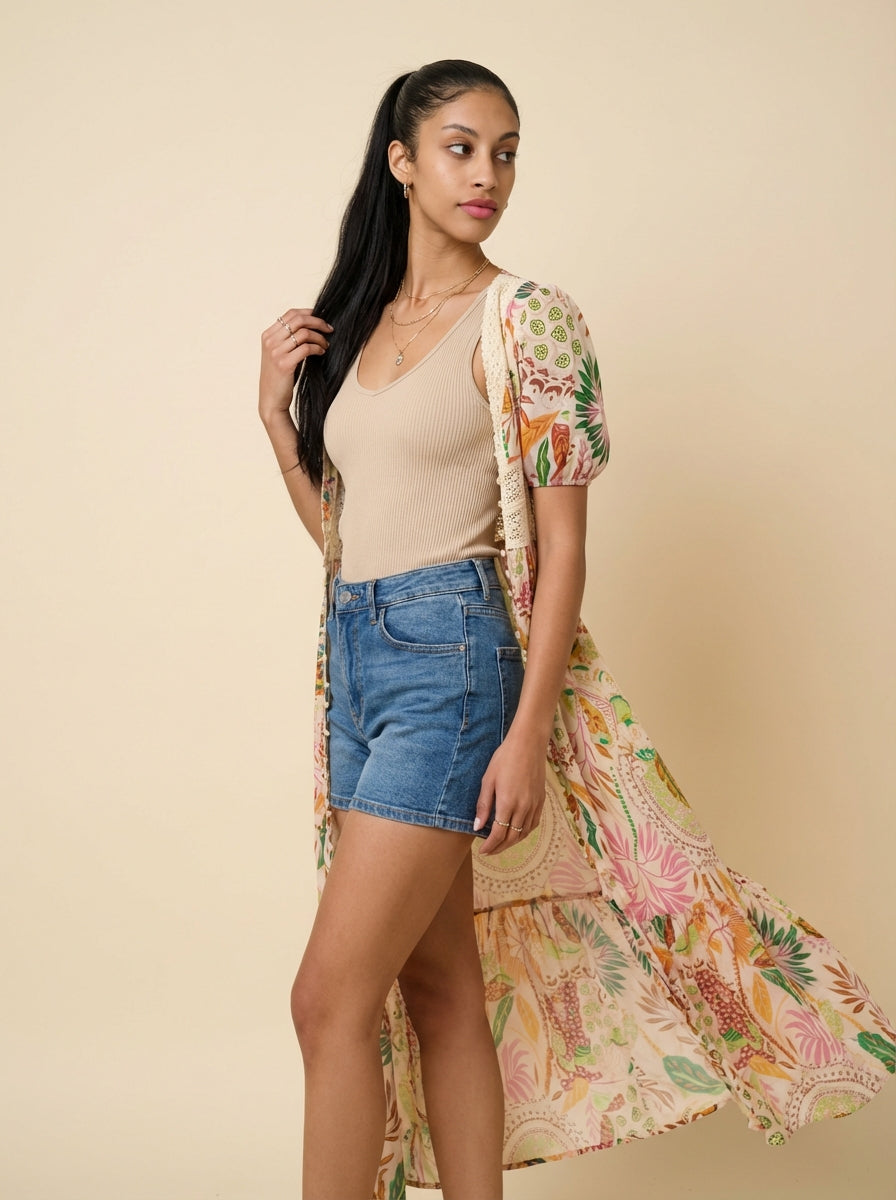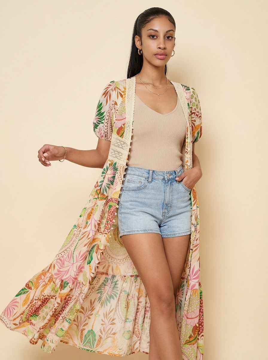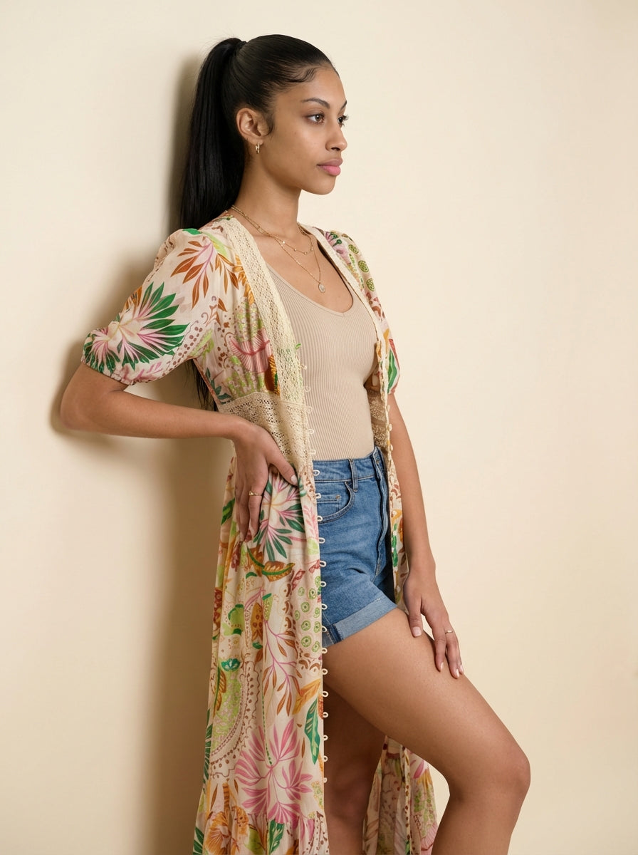 Lace Trim Floral Print Puff Sleeve Dress & Duster