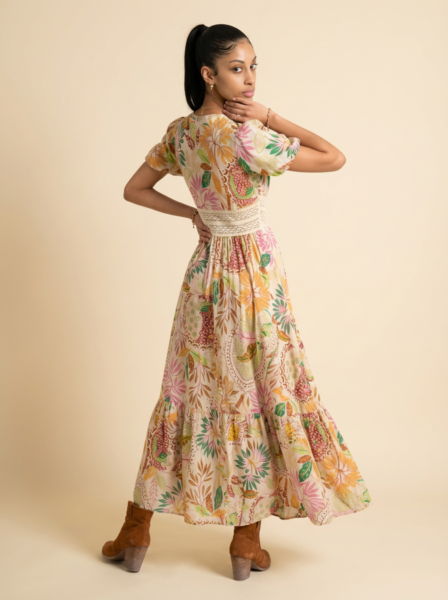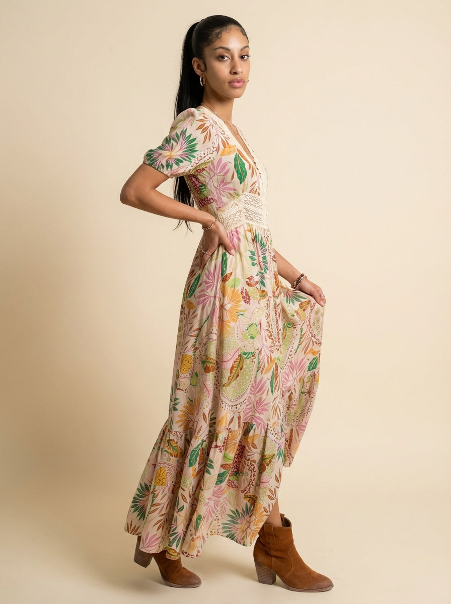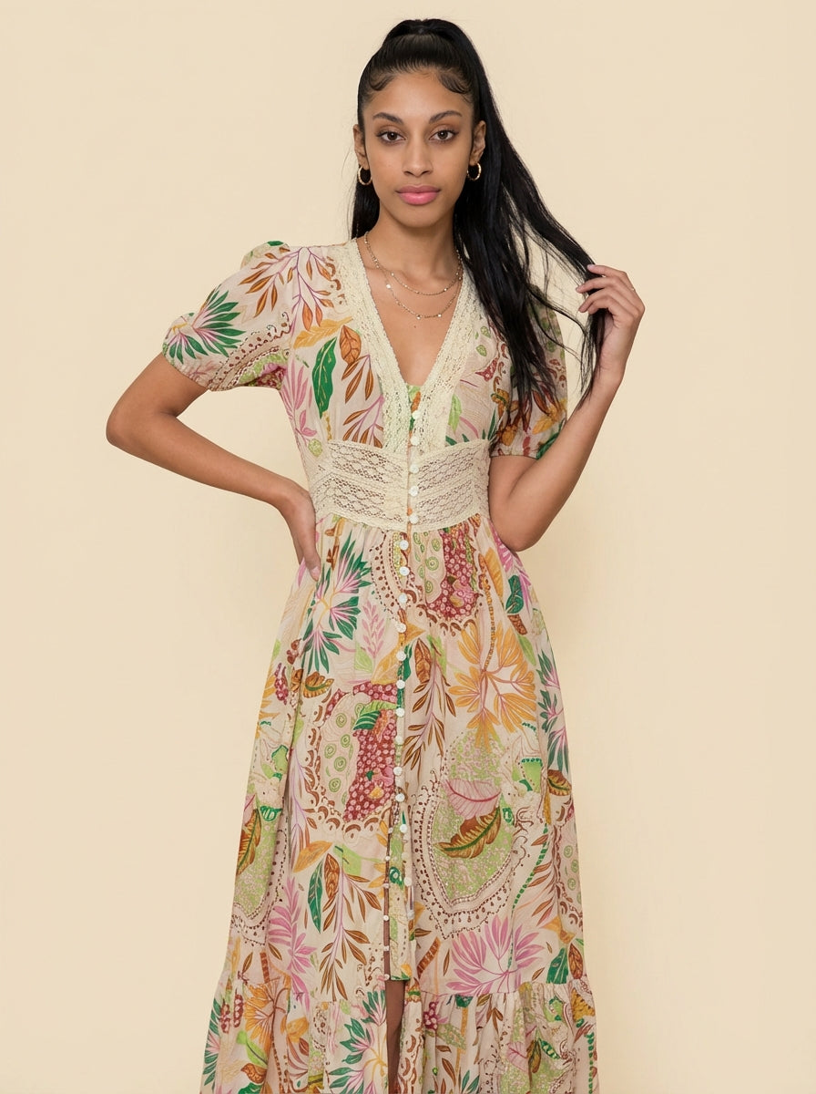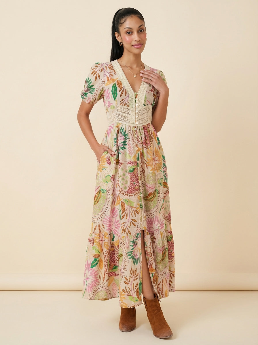 Lace Trim Floral Print Puff Sleeve Dress & Duster