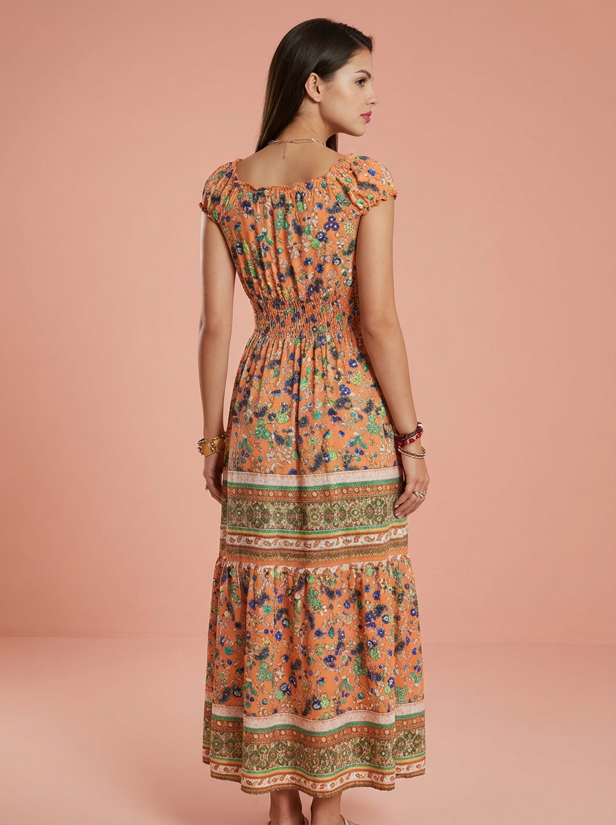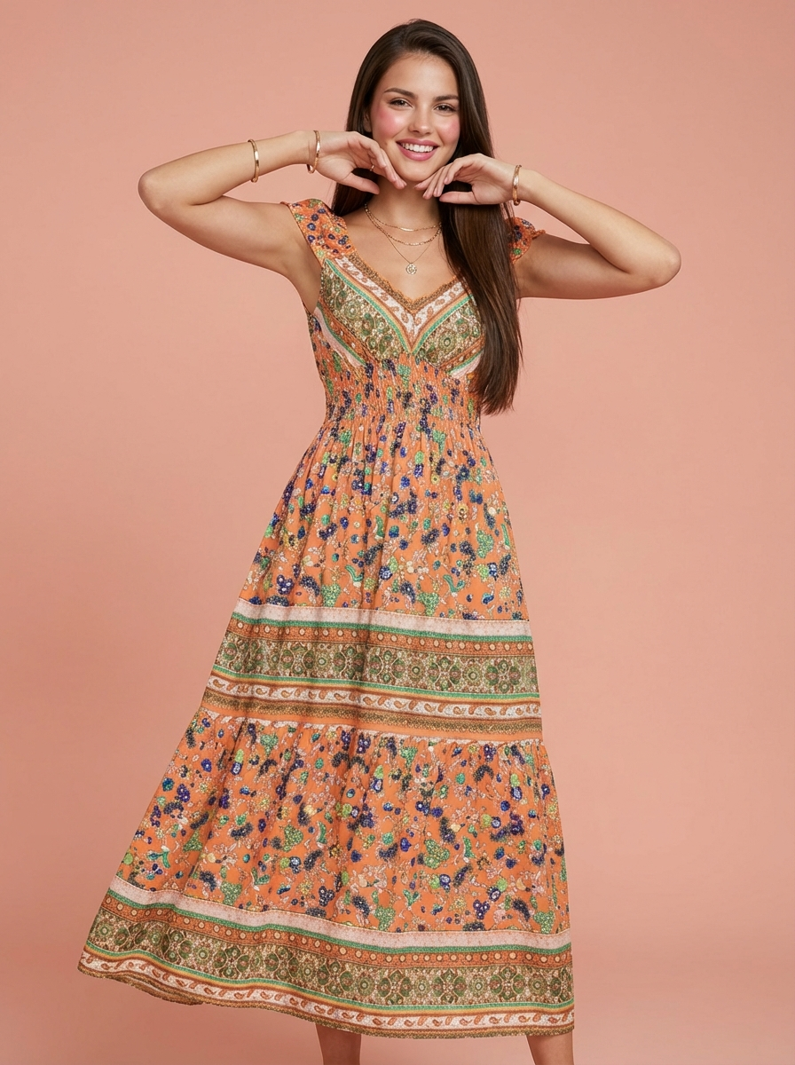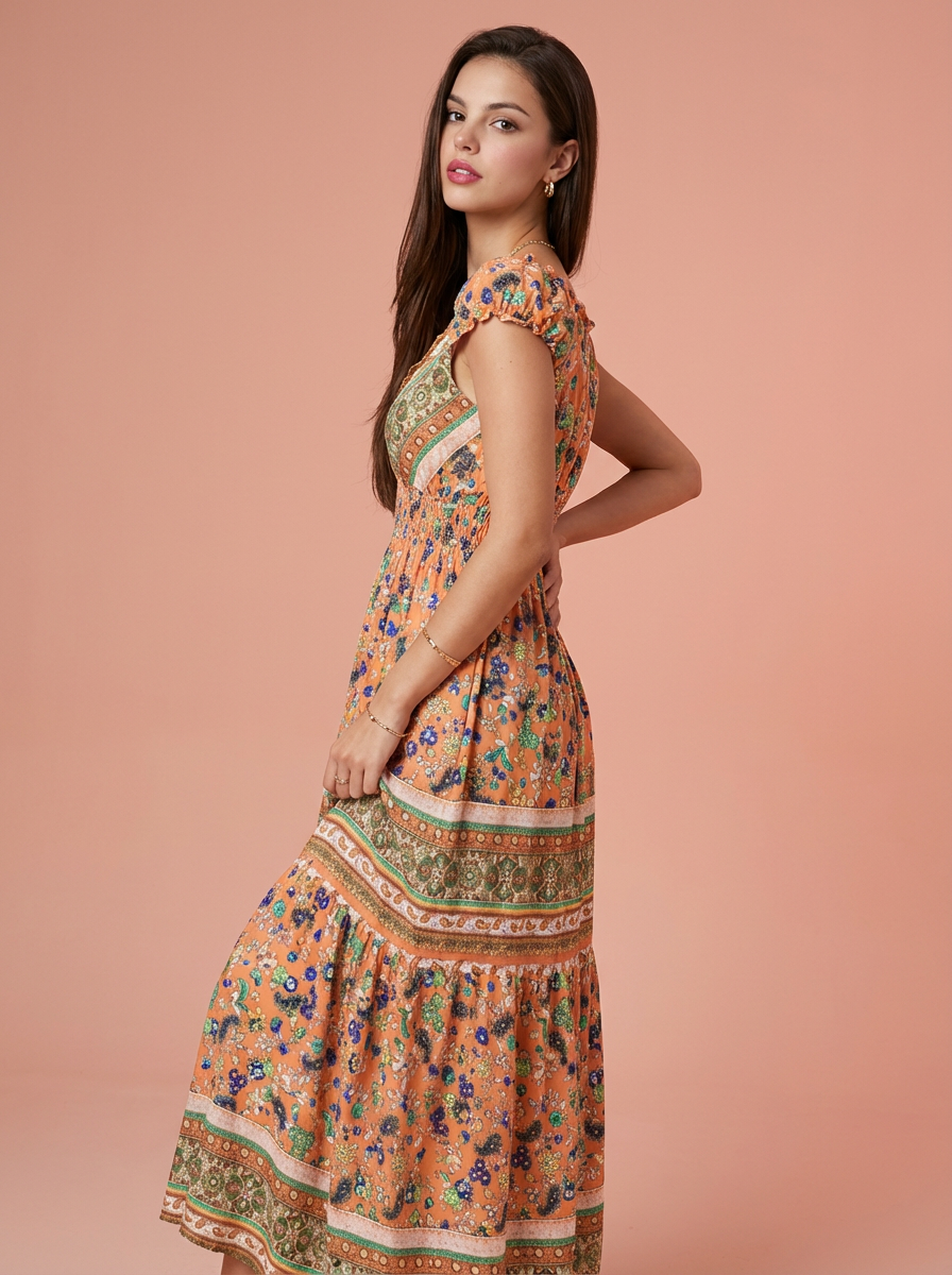Smocked Printed V-Neck Cap Sleeve Dress