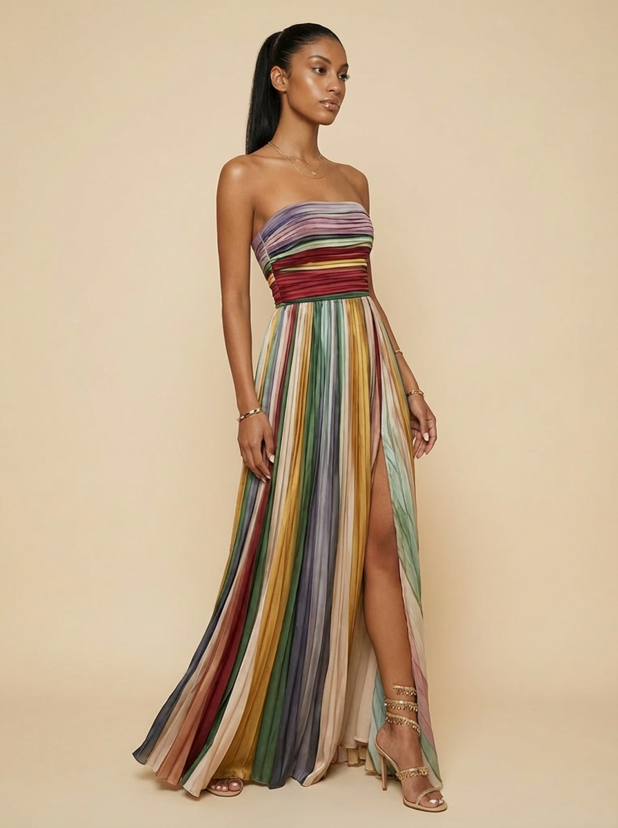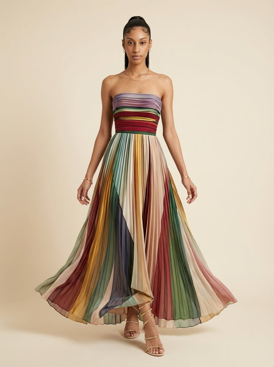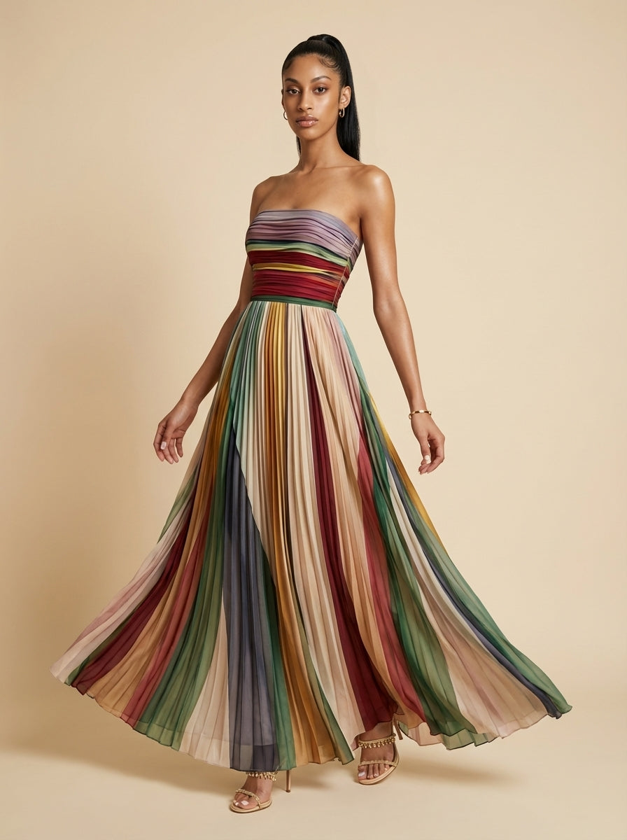 Selene Striped Pleated Strapless Maxi Dress