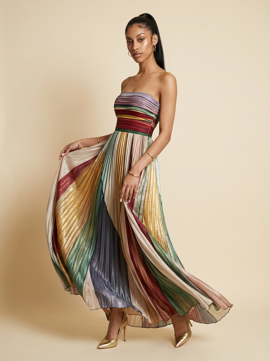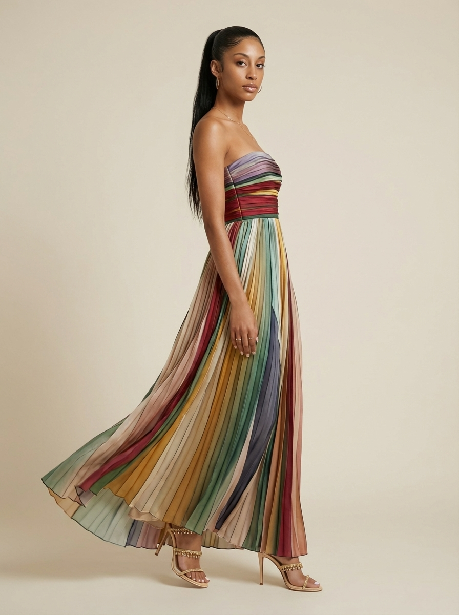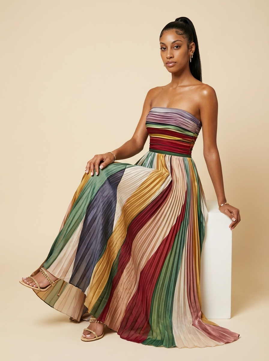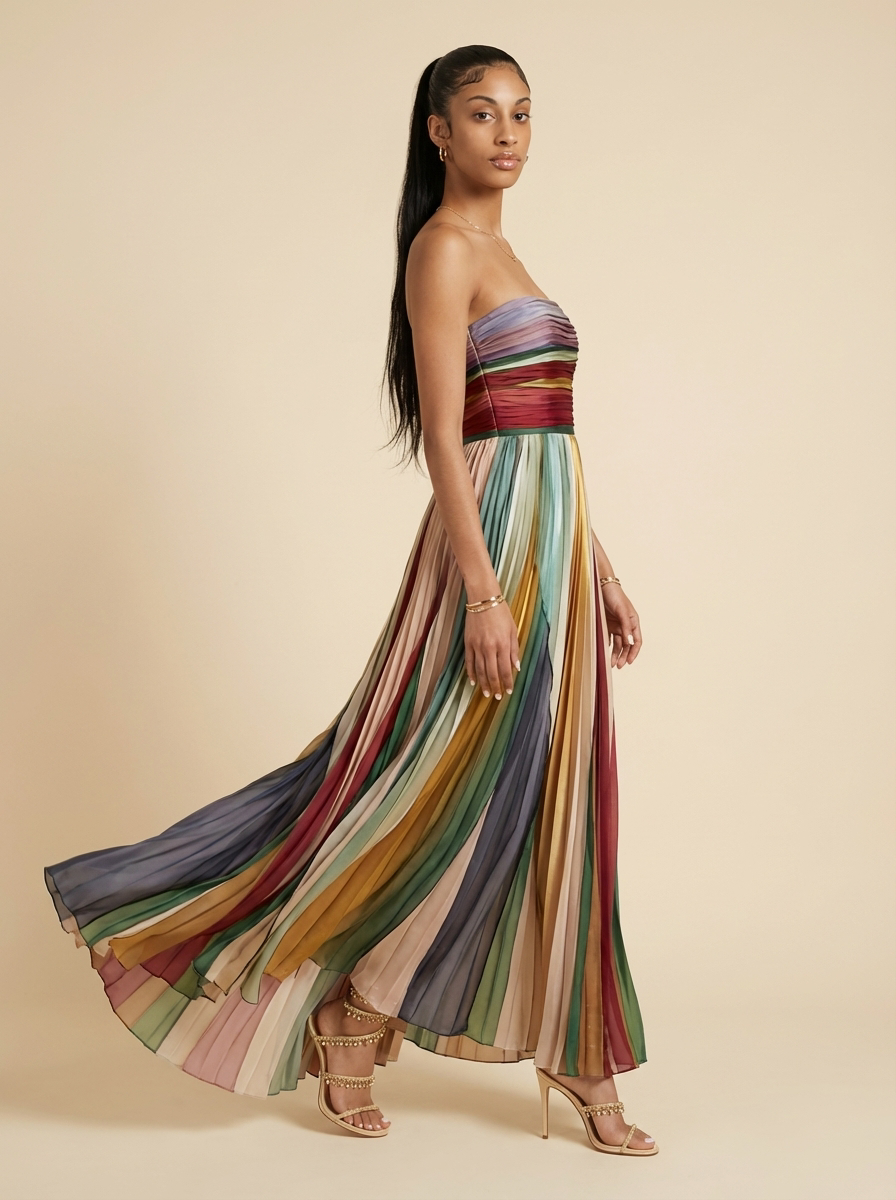 Selene Striped Pleated Strapless Maxi Dress